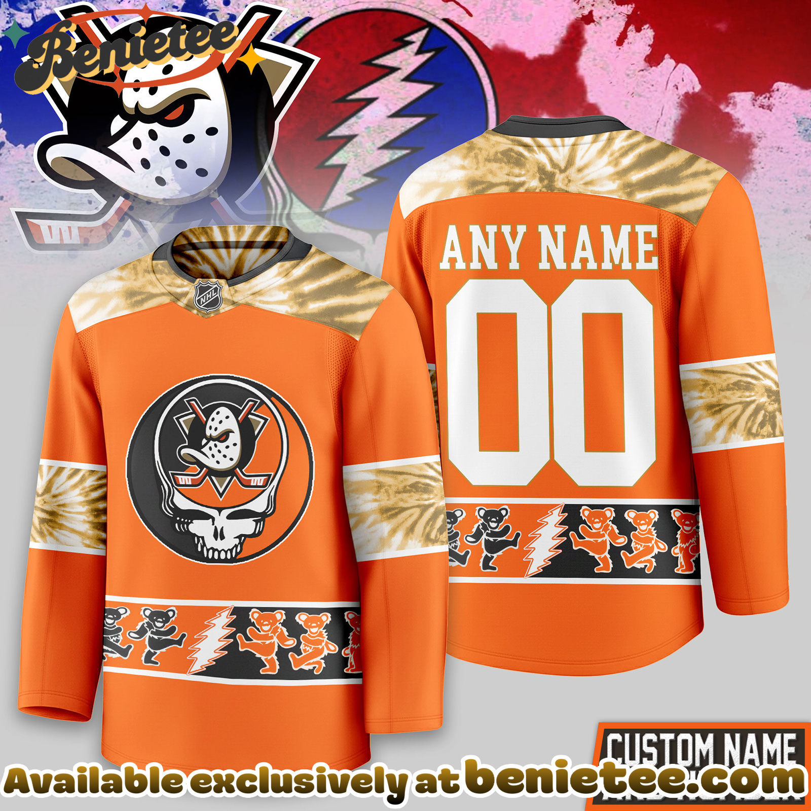 ⚡ Customize your Anaheim Ducks Premium NHL Tie-Dye Skull Hockey Jersey now and wear your hockey passion with confidence and style! 🏒🔥