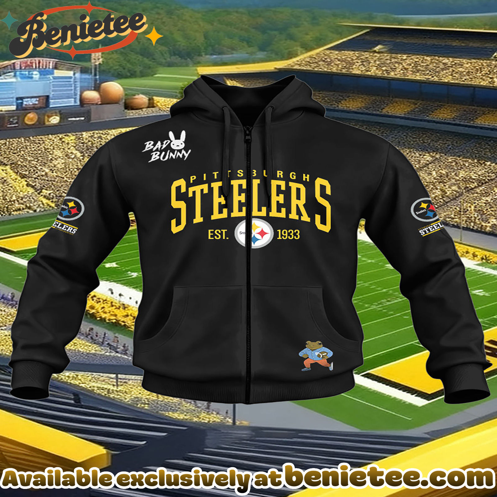 Unleash your inner fan with this exclusive Bad Bunny x Steelers collaboration unisex zip-up hooded jacket. Perfect for any dedicated supporter, this jacket seamlessly blends the iconic style of Bad Bunny with the powerful legacy of the Pittsburgh Steelers. Crafted for comfort and durability, it features a full zip closure, adjustable hood, and spacious pockets, making it ideal for game days, casual outings, or simply showcasing your passion. The unique design incorporates elements that celebrate both the global music sensation and the storied NFL franchise, offering a statement piece that stands out. Get ready to turn heads and represent your favorite artist and team with this must-have addition to your wardrobe.