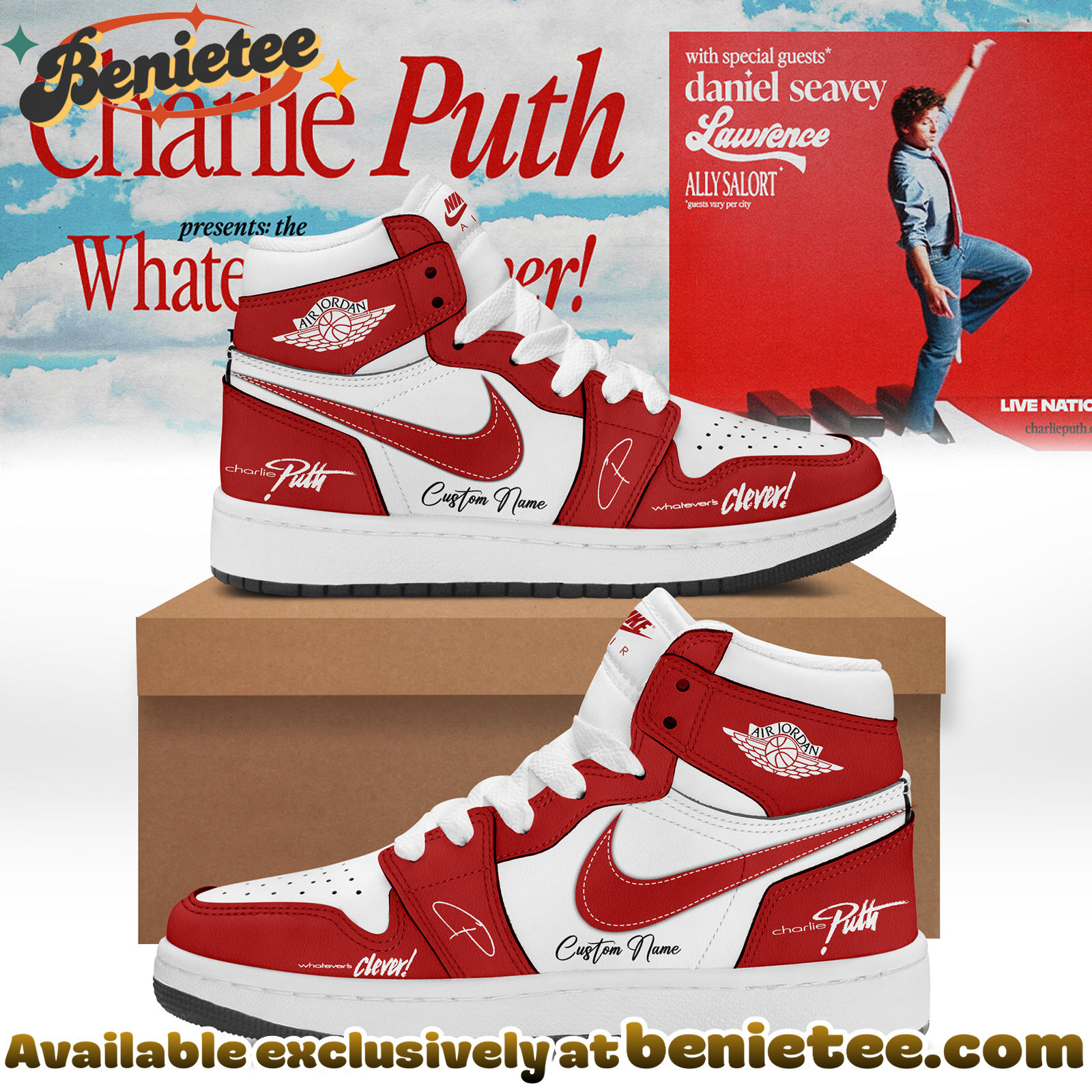 Celebrate Charlie Puth’s ‘The Whatevers’ Clever World Tour with these exclusive Nike Air Force 1s, Ver 22. This design brilliantly merges the vibrant energy of Puth’s music with the iconic status of Nike Air Force 1 sneakers. Featuring unique graphics inspired by the tour’s aesthetic and Puth’s signature style, these shoes are a must-have for any dedicated fan. The keywords ‘Charlie Puth’, ‘The Whatevers’, ‘Clever World Tour’, ‘Shoes’, and ‘Nike Air Force 1’ are all prominently integrated, ensuring high visibility for fans searching for tour merchandise and stylish footwear.