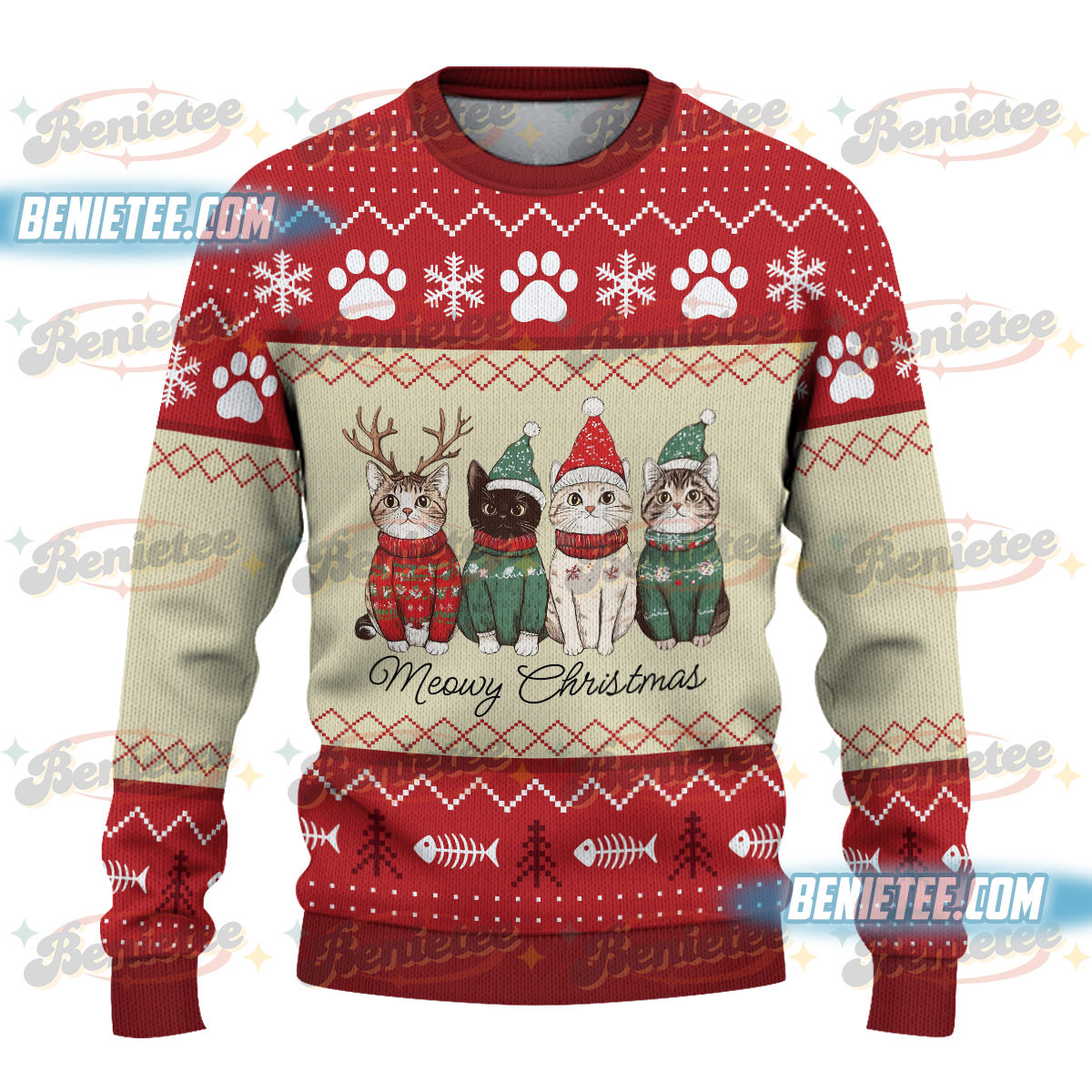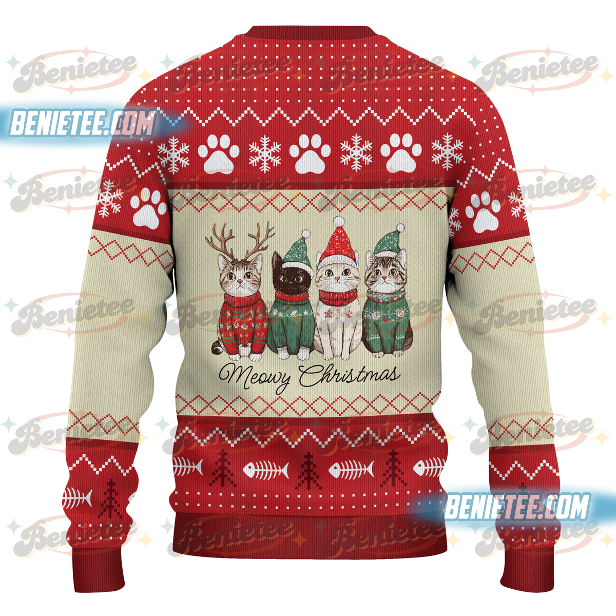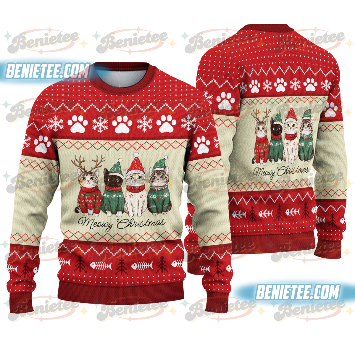 Christmas Cat Ugly Sweatshirt, Meowy Christmas Cats with Santa Claus Sweatshirt, Happy New Year Sweatshirt, Cat Lovers Sweater