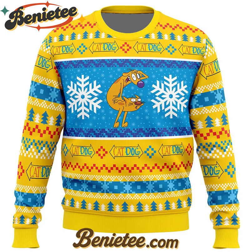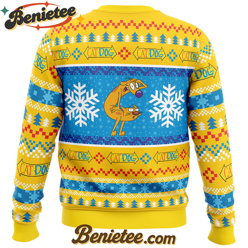Embrace the holiday spirit with a touch of nostalgic 90s cartoon charm! This unique Christmas CatDog Nickelodeon Ugly Christmas Sweater is the perfect way to stand out at any festive gathering. Featuring the iconic, lovable, and hilariously mismatched CatDog, this sweater brings back cherished memories of Saturday morning cartoons and carefree days. Crafted for comfort and designed to spread cheer, it’s ideal for ugly sweater parties, holiday movie marathons, or simply lounging around while enjoying the festive season. Show off your love for this classic Nickelodeon show and make a bold statement that’s both fun and fashionable. Don’t miss out on adding this must-have piece to your holiday wardrobe – grab yours today and let the good times roll!