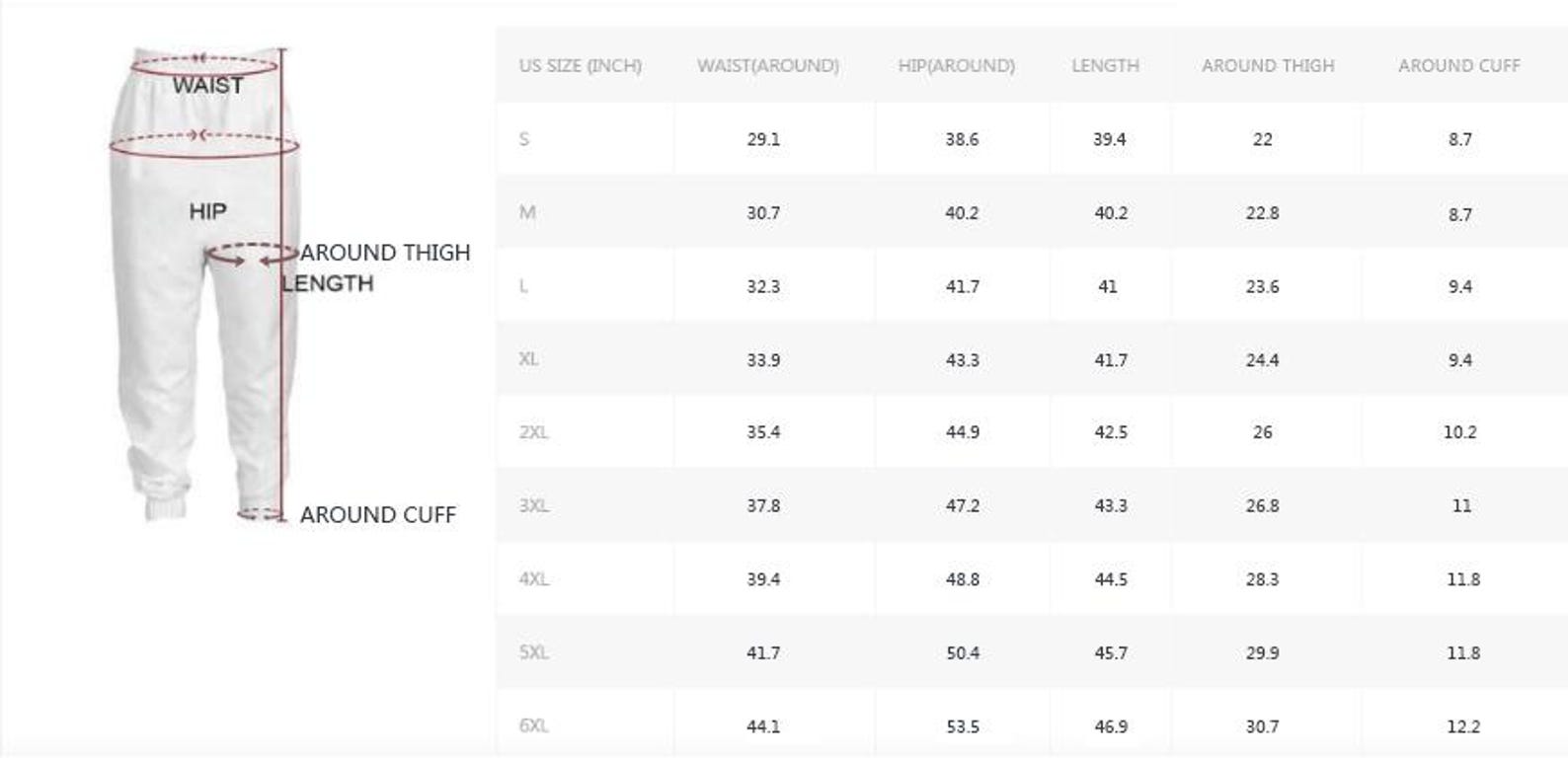 US SIZE | WAIST (in) | LENGTH (in) | HIPS (in) |