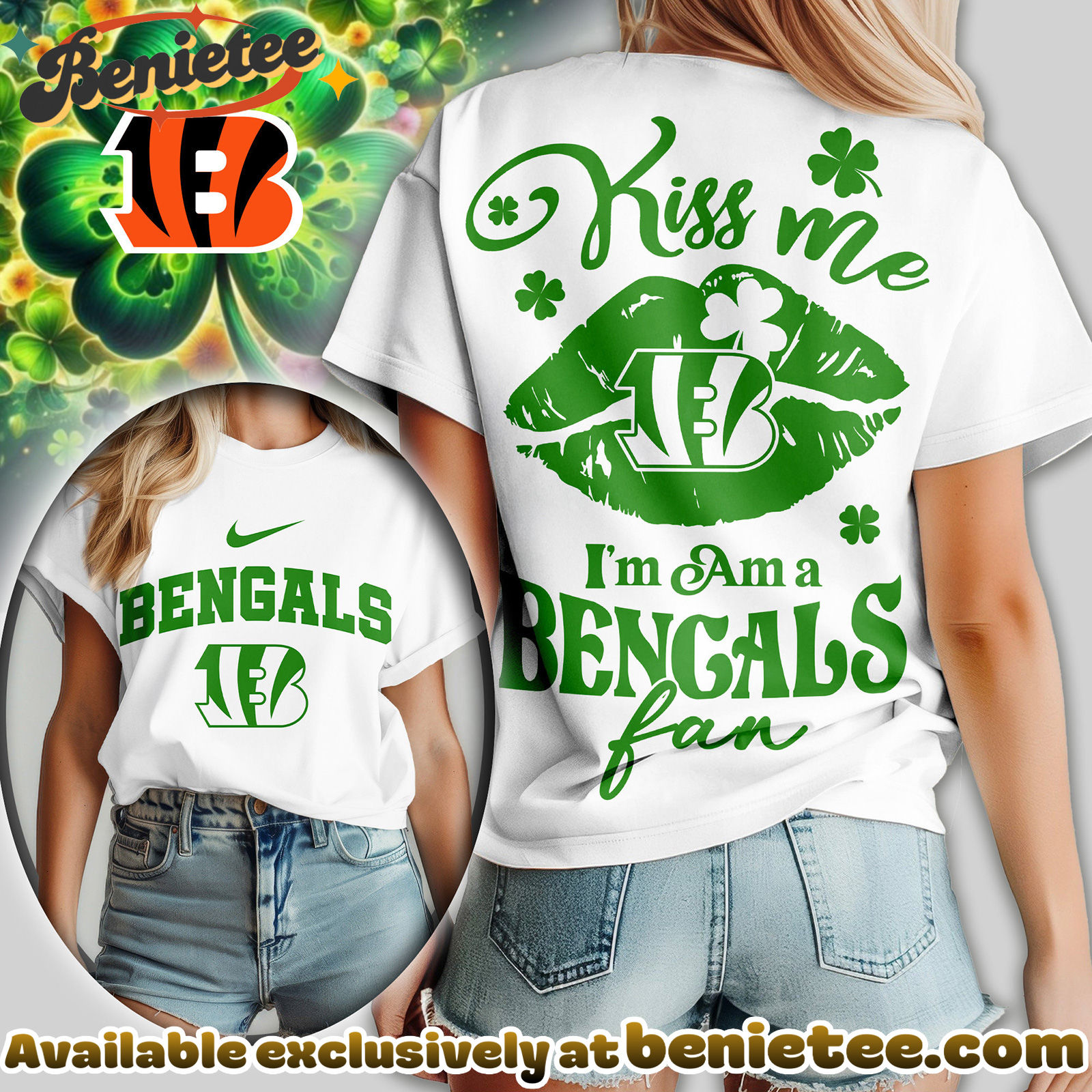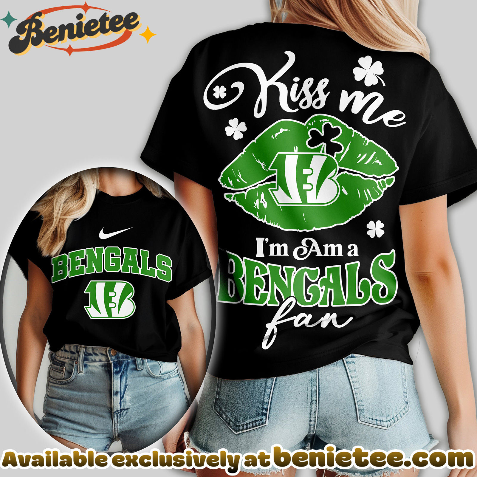 ⚡ Elevate your wardrobe with Cincinnati Bengals Premium NFL Kiss Me St. Patricks Day Women Tshirt, Hoodie, Sweatshirt and enjoy high-impact 3D style with everyday comfort. ✨