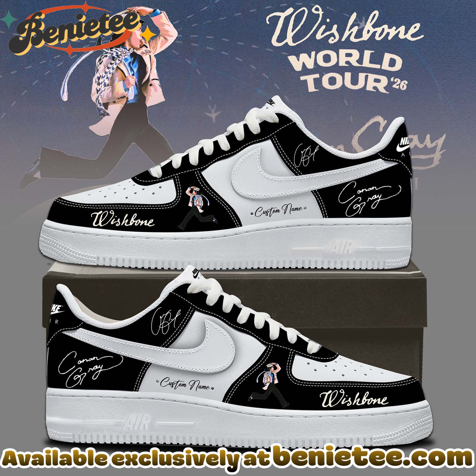 Celebrate the enchanting “Wishbone World Tour” with these exclusive Air Force 1 sneakers, inspired by the unique artistry of Conan Gray. Designed for fans who want to carry a piece of his magical musical journey with them, these shoes capture the essence of his latest tour. Each pair is a testament to the vibrant energy and heartfelt lyrics that define Conan Gray’s music, making them a perfect addition to any fan’s collection. Step out in style and show your love for one of music’s most captivating artists. Get yours today and walk in the world of “Wishbone”!