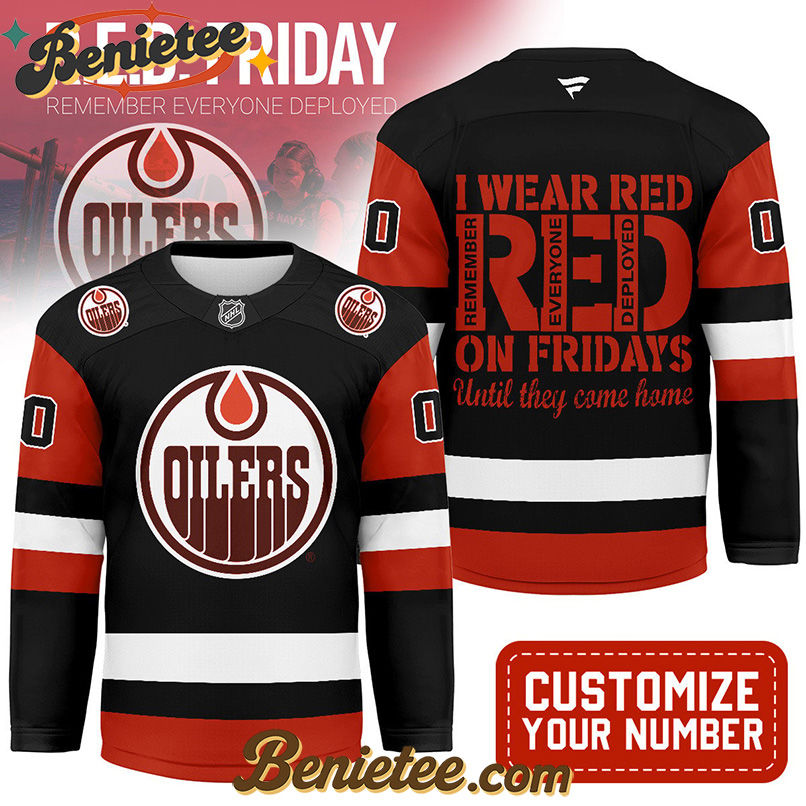 Step up your style with the Edmonton Oilers – Premium NHL Red Friday Hockey Jersey — where sport meets street in one bold jersey.