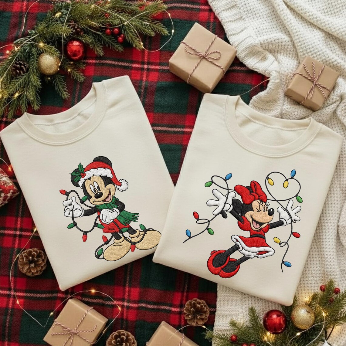 EMBROIDERED Mickey Minnie Christmas Sweatshirt, Disney Embroidered Couple Holiday Sweater, Cozy Xmas Lights Crewneck, Matching Disney Outfit