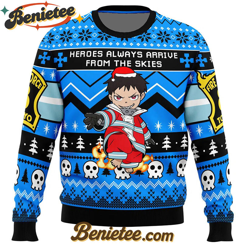 Embrace the Festive Flames with the Heroes Always Arrive Fire Force Ugly Christmas Sweater!
