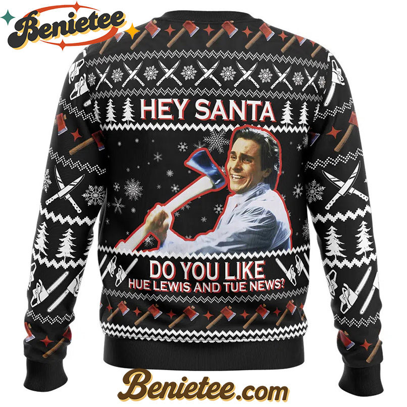 Celebrate the season with the Hey Santa Do You Like Hue Lewis and Tue News American Psycho Ugly Christmas Sweater — a playful, cozy ugly sweater made for joyful holiday moments.