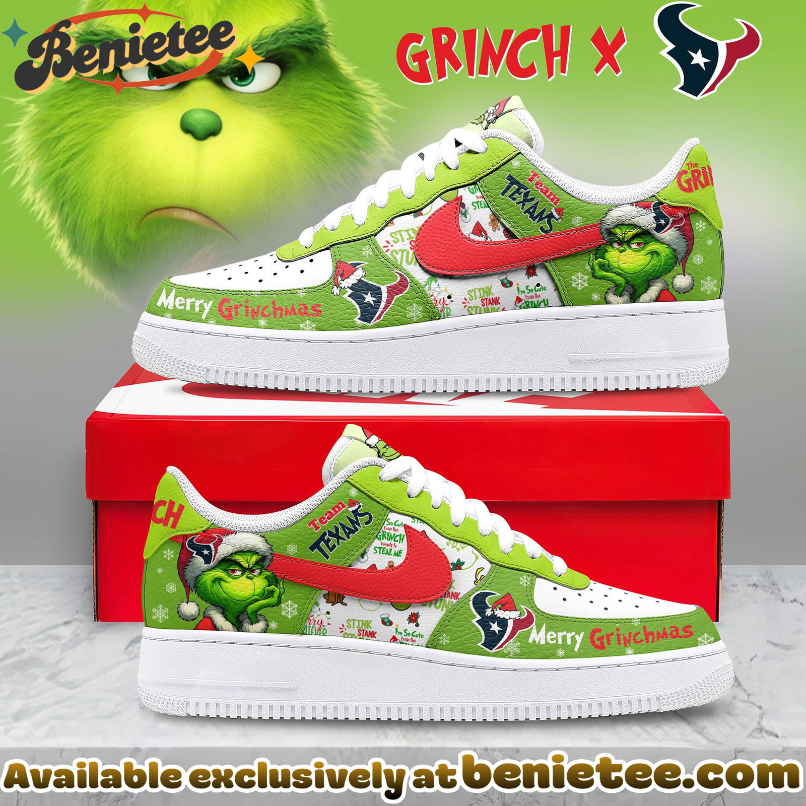 Step into the Holiday Spirit with the Houston Texans Premium NFL Grinch SHOES Air Force 1 Limited Edition