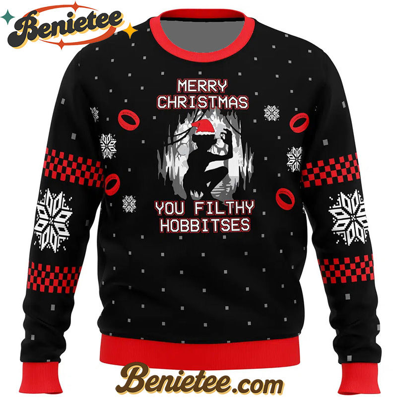 Embrace the Shire’s Holiday Spirit with Our Lord of the Rings Filthy Hobbitses Ugly Christmas Sweater!