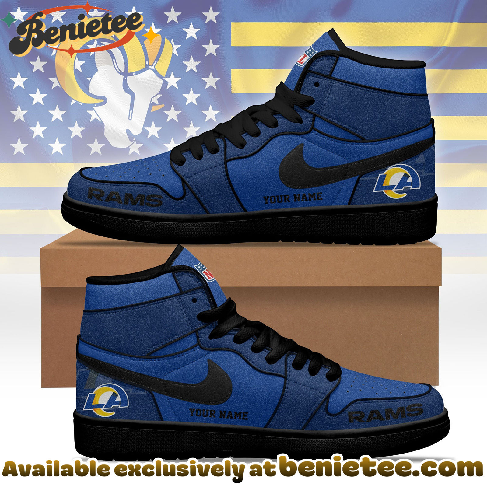 Celebrate your passion for the Los Angeles Rams and iconic sneaker culture with these exclusive Jordan 1 High Tops. Featuring premium materials and a design inspired by the Rams’ iconic colors and branding, these sneakers are a must-have for any dedicated fan. The fusion of NFL pride and the legendary Nike Air Jordan 1 silhouette creates a unique statement piece that stands out from the crowd. Perfect for game days or everyday wear, these kicks embody the spirit of victory and timeless style.