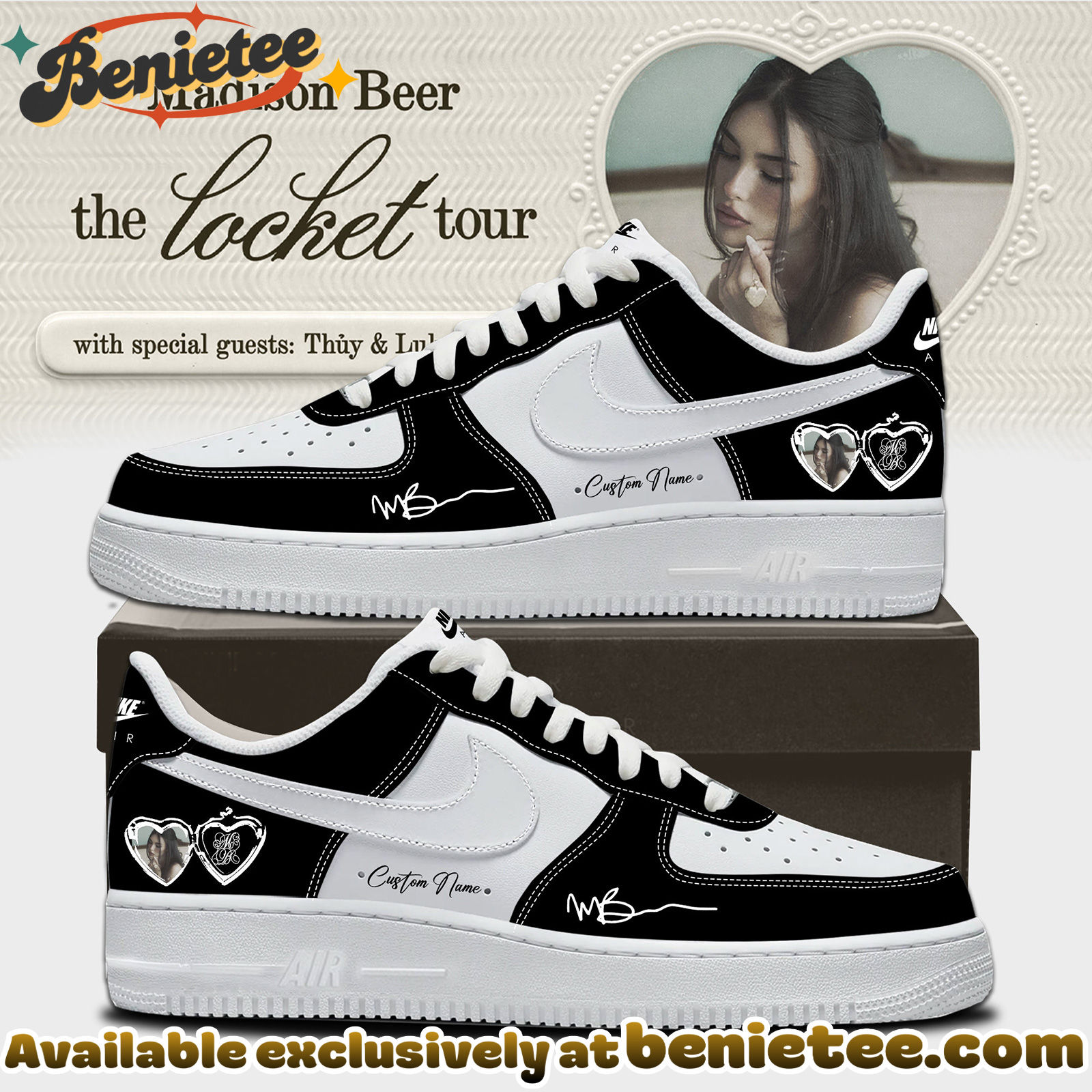 Celebrate Madison Beer’s iconic ‘The Locket Tour’ with these exclusive Nike Air Force 1s, Version 17. This design captures the essence of the tour, blending the artistry of Madison Beer’s music with the timeless appeal of the classic Nike Air Force 1 silhouette. Perfect for fans who want to showcase their love for the artist and her latest tour, these shoes are a statement piece that merges pop culture with streetwear. The intricate details and unique aesthetic make them a must-have for any dedicated fan looking to commemorate this musical journey. Keywords like ‘Madison Beer,’ ‘The Locket Tour,’ ‘Nike Air Force 1,’ and ‘exclusive fan gear’ are central to this design’s appeal.