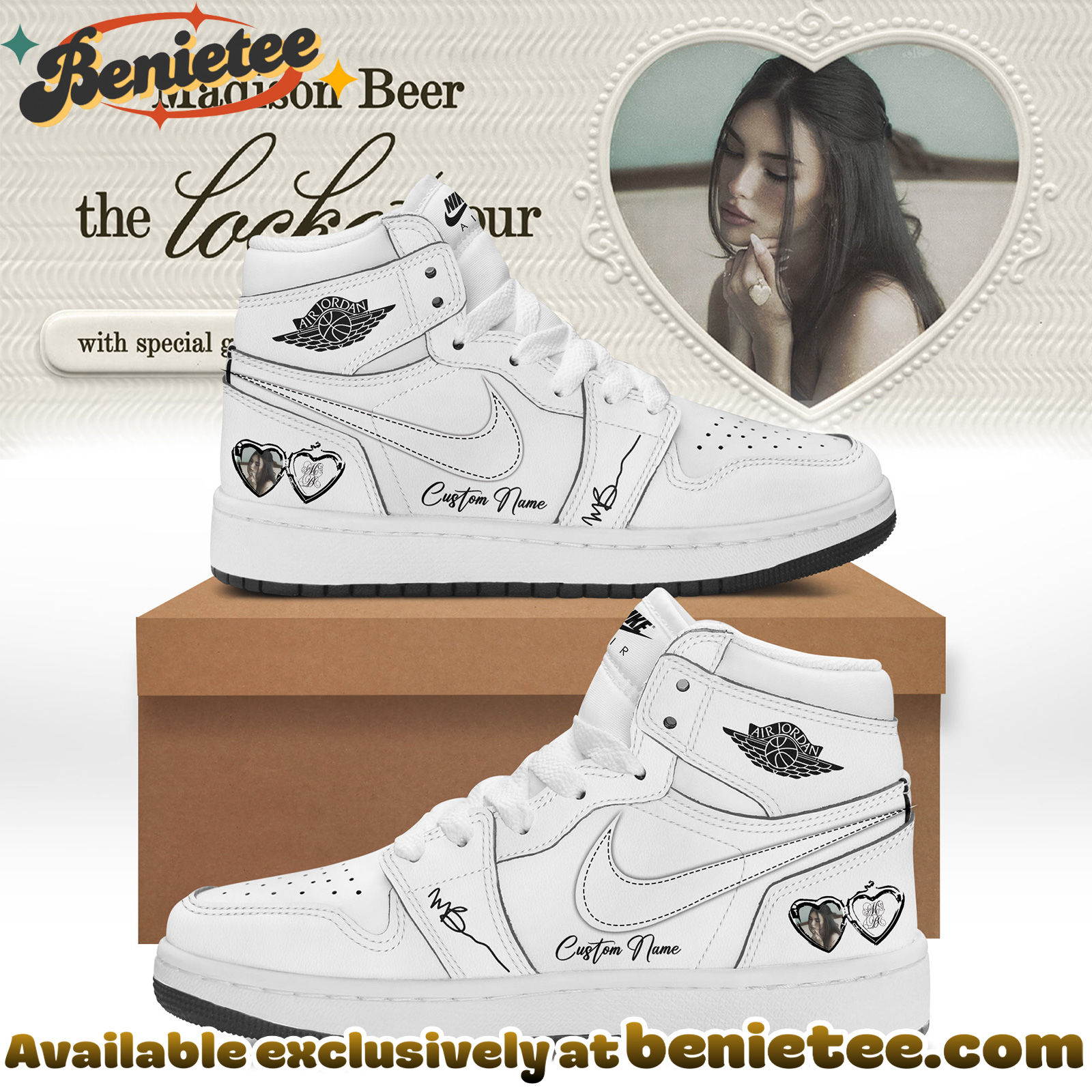 Crafted with premium materials, these Nike Air Jordan 1s offer unparalleled comfort and durability, ensuring they look as good as they feel, whether you’re dancing at a concert or walking through your day. The ‘Ver 14’ iteration is meticulously detailed to reflect the spirit of ‘The Locket Tour,’ making it an ideal gift for any Madison Beer enthusiast or a special treat for yourself. Elevate your sneaker collection and commemorate this unforgettable tour with footwear that blends iconic design with the passion of a devoted fanbase. Don’t miss out on owning a piece of music and sneaker history.