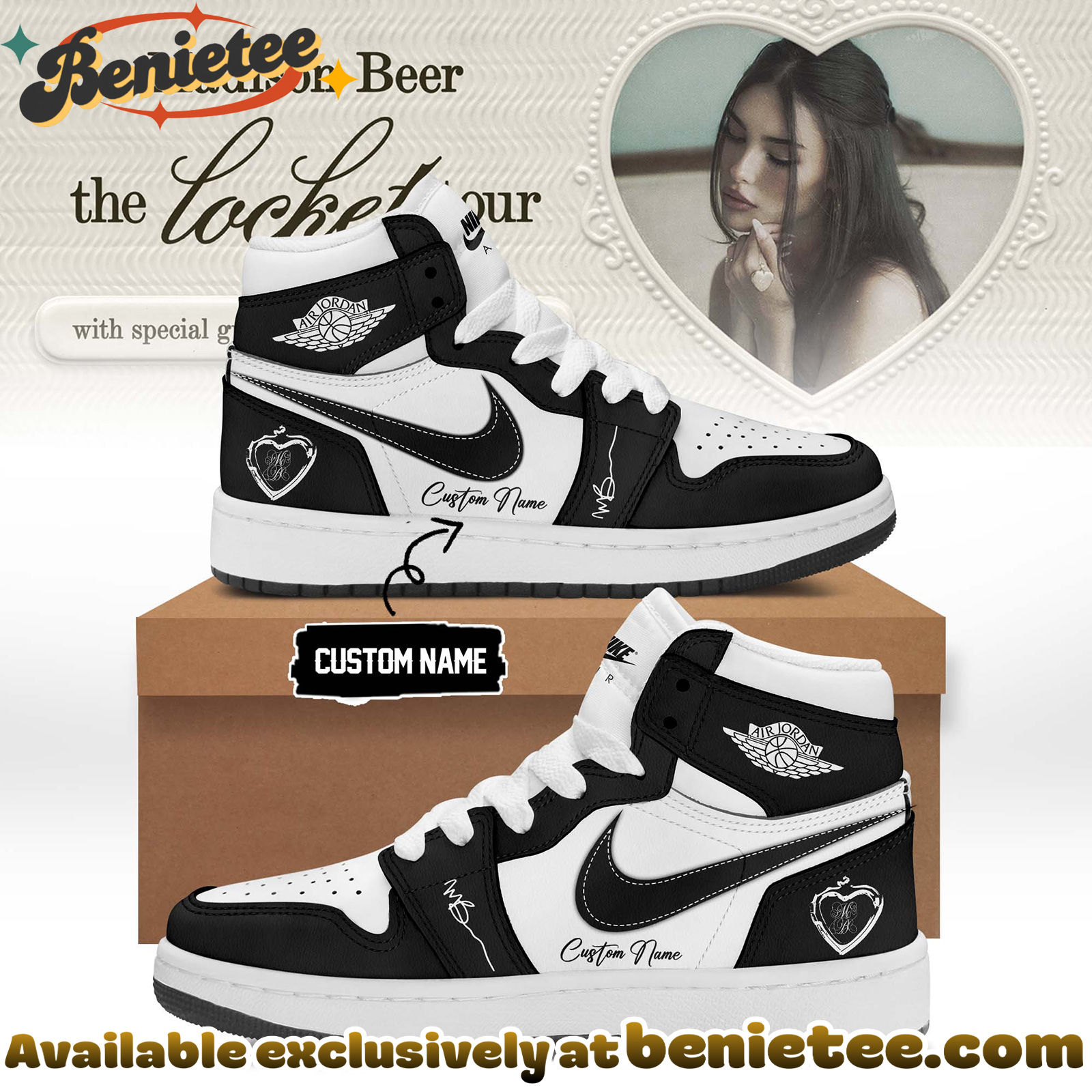 Celebrate Madison Beer’s ‘The Locket Tour’ with these exclusive Nike Air Jordan 1 – Ver 3 shoes. This design masterfully fuses the iconic silhouette of the Air Jordan 1 with the artistic essence of Madison Beer’s latest tour. Perfect for fans, sneakerheads, and fashion-forward individuals, these shoes are a statement piece that captures the energy of live music and legendary streetwear. The ‘Ver 3’ designation suggests a unique iteration, making these a must-have collectible for anyone who appreciates the blend of pop culture and athletic footwear.
