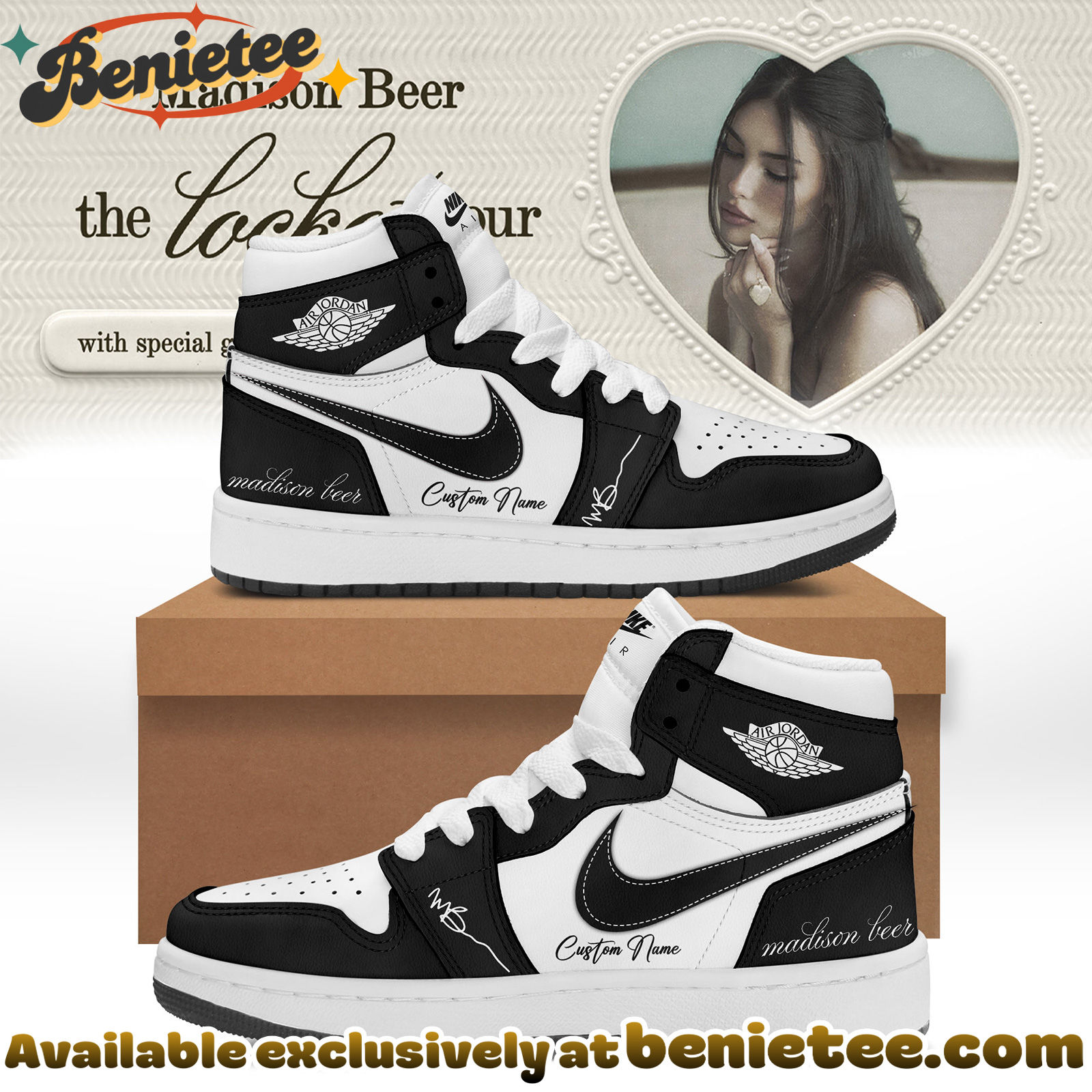 Crafted with the premium quality expected from Nike Air Jordan 1, these shoes offer both exceptional comfort and durability. Perfect for concerts, casual outings, or simply showcasing your fandom, they are designed to make a statement. Whether you’re attending ‘The Locket Tour’ or just want to add a unique piece to your sneaker collection, the Ver 7 offers a stylish and meaningful way to express your appreciation for Madison Beer’s artistry and the iconic Jordan brand.