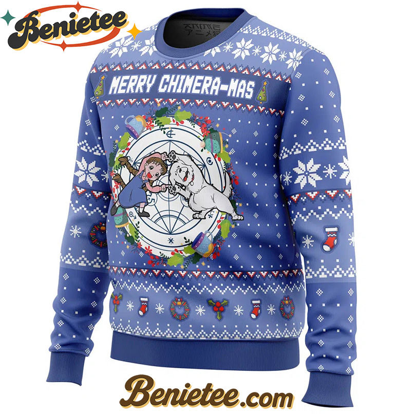 Celebrate the season with the Merry Chimera-mas Fullmetal Alchemist Christmas Sweater — a playful, cozy ugly sweater made for joyful holiday moments.