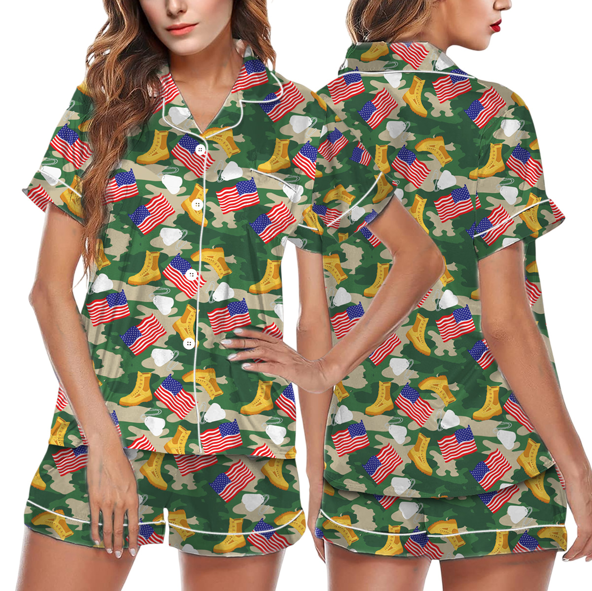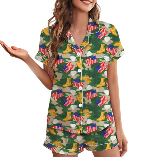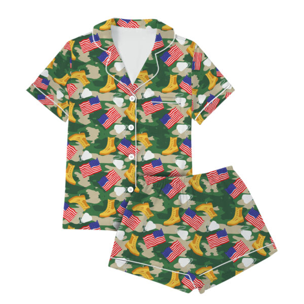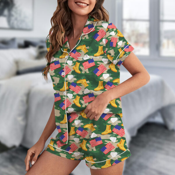 Military Girly Shirt, Camo Bow Army Pajamas Set Short, Patriotic Veteran Graphic T-Shirt, Support Our Troops Shirt, Army Mom Gift, USA Pride Tee