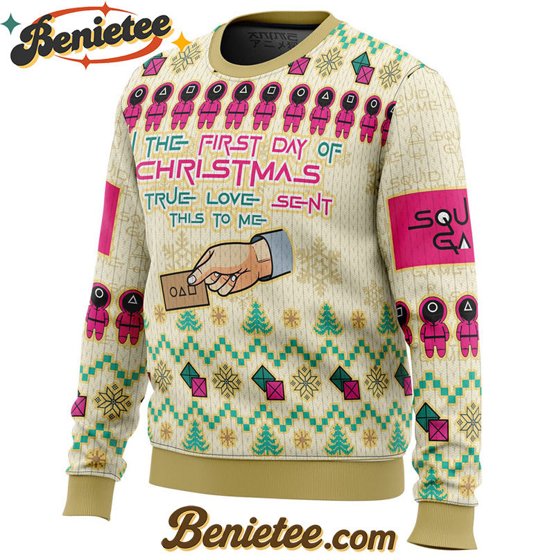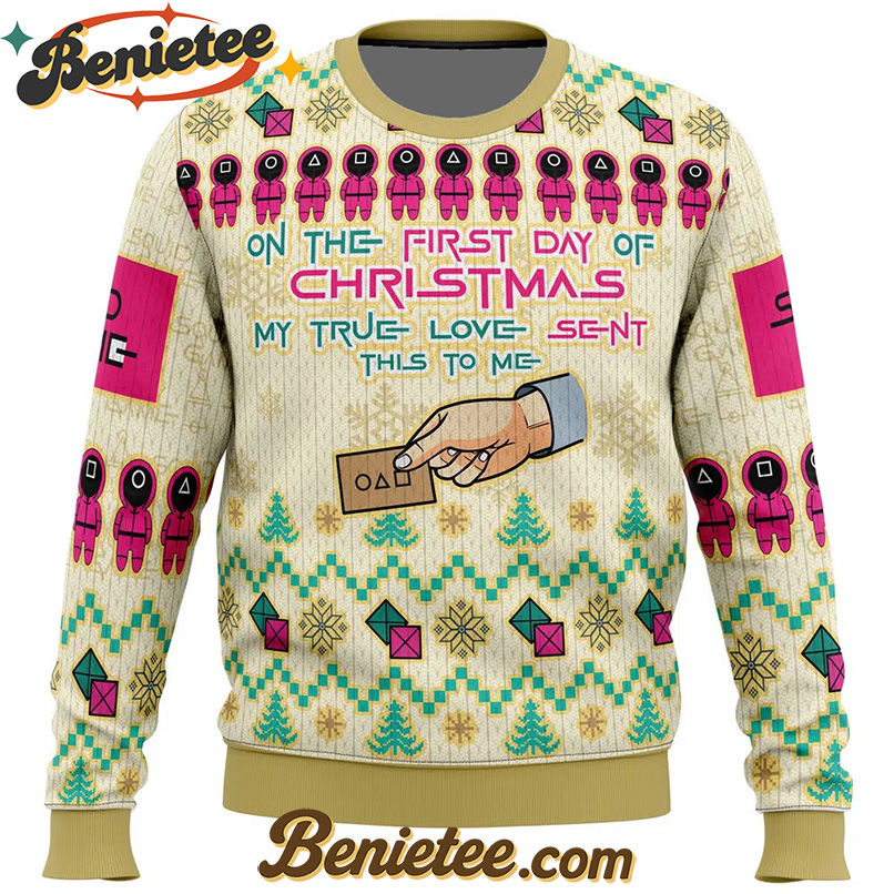 Celebrate the season with the On the First Day of Christmas Squid Game Christmas Sweater — a playful, cozy ugly sweater made for joyful holiday moments.