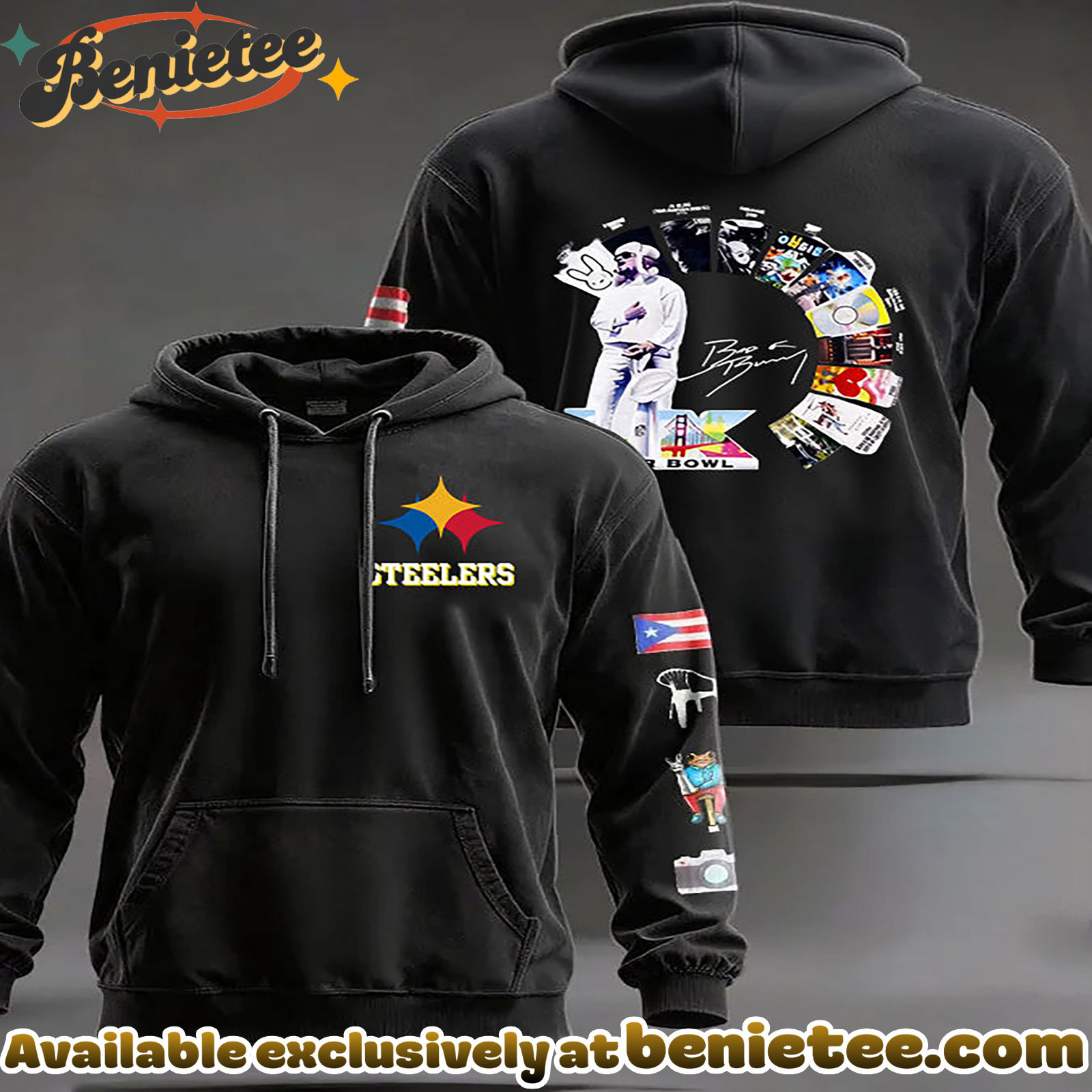 Embrace the energy of Pittsburgh’s beloved football team and the infectious rhythms of Bad Bunny with this one-of-a-kind hoodie. Crafted for comfort and designed for standout style, it’s the ultimate way to express your dual fandom. Imagine the conversations this unique piece will spark, uniting fans of the Pittsburgh Steelers and admirers of Bad Bunny’s revolutionary music. It’s more than just apparel; it’s a conversation starter, a testament to your eclectic taste, and a comfortable way to showcase your allegiances. Elevate your wardrobe with this distinctive piece that bridges the gap between sports enthusiasm and contemporary music culture. Secure yours today and wear your passion with pride.