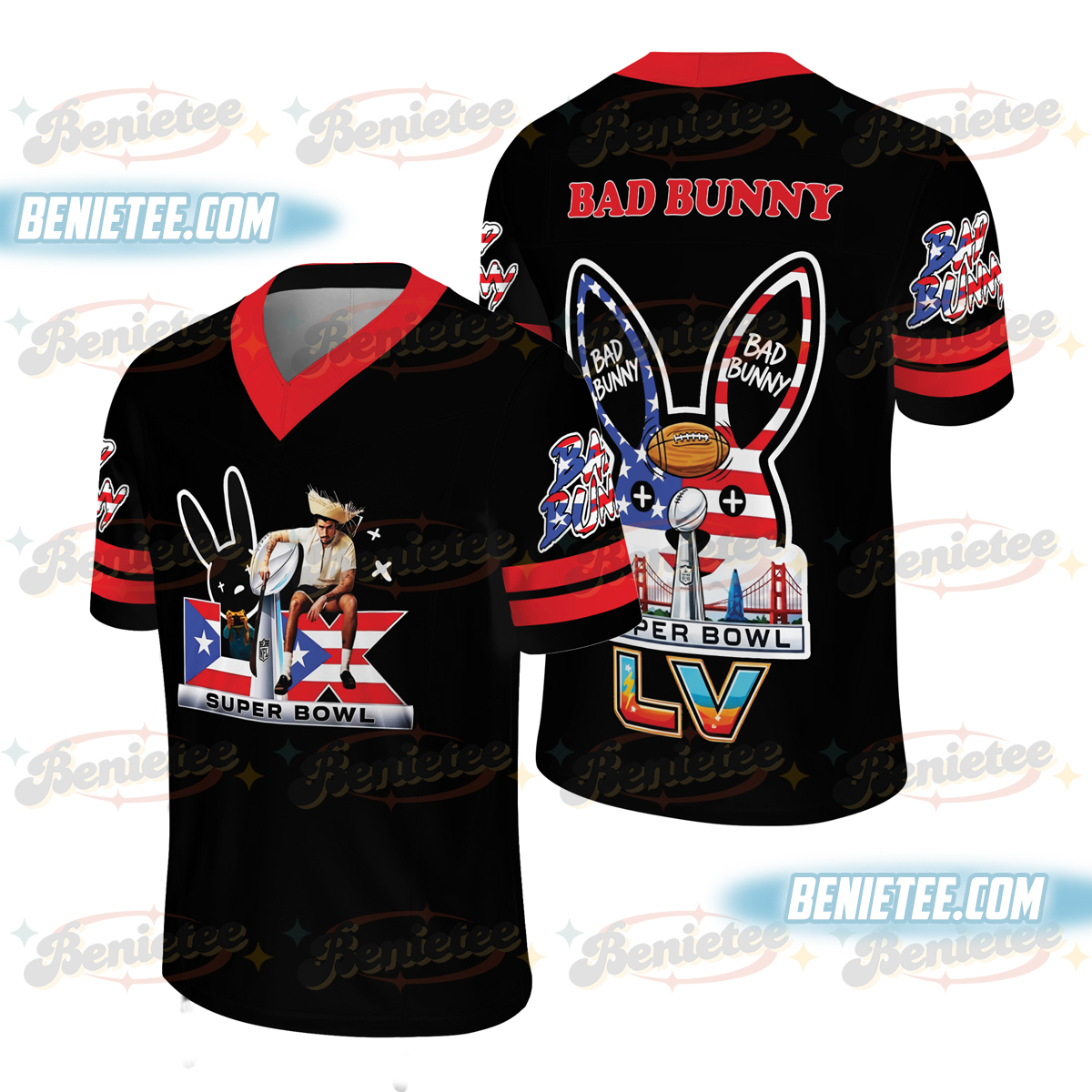 Bad Bunny Super Bowl 2026 Football Jersey for men with all-over rock band graphic print, soft cotton blend fabric, unisex US fit, available in multiple sizes.