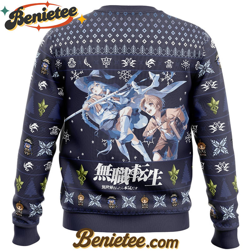 Get ready to jingle all the way with this unique and officially licensed Mushoku Tensei Jobless Reincarnation Ugly Christmas Sweater, featuring beloved characters Roxy Migurdia and Rudeus Greyrat. Perfect for anime fans and holiday enthusiasts alike, this festive sweater combines the warmth of the holiday season with your favorite isekai adventure. Crafted for comfort and designed to stand out, it’s the ideal attire for ugly sweater parties, holiday gatherings, or simply lounging at home while rewatching your favorite episodes. Don’t miss out on the chance to showcase your love for Mushoku Tensei in the most festive way possible – grab yours today and make this Christmas truly magical!
