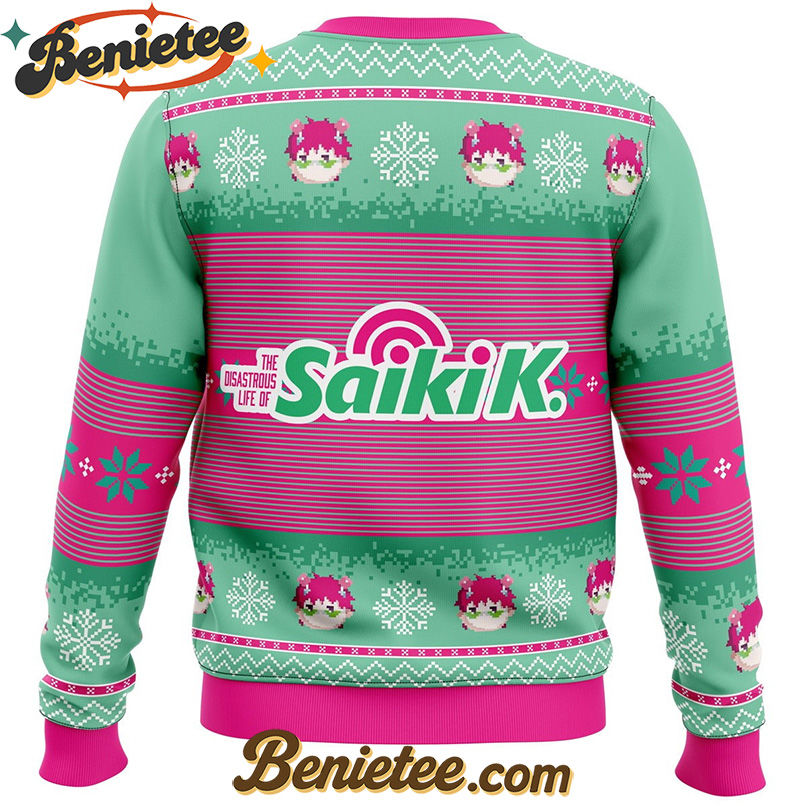 Get ready to bring the full force of psychic chaos to your holiday celebrations with the ultimate Saiki K The Disastrous Life of Saiki K Ugly Christmas Sweater. This isn’t just any festive knit; it’s a declaration of your love for one of anime’s most uniquely hilarious protagonists. Featuring iconic imagery and a design that perfectly captures Saiki’s perpetually exasperated aura, this sweater is guaranteed to be a conversation starter at any holiday party. Whether you’re a long-time fan of Kusuo Saiki’s struggles with his overwhelming psychic powers or a newcomer drawn to the show’s quirky humor and relatable characters, this sweater is the perfect way to showcase your fandom. Don’t miss out on the chance to own a piece of anime holiday magic – grab your Saiki K ugly Christmas sweater and make this season disastrously festive!