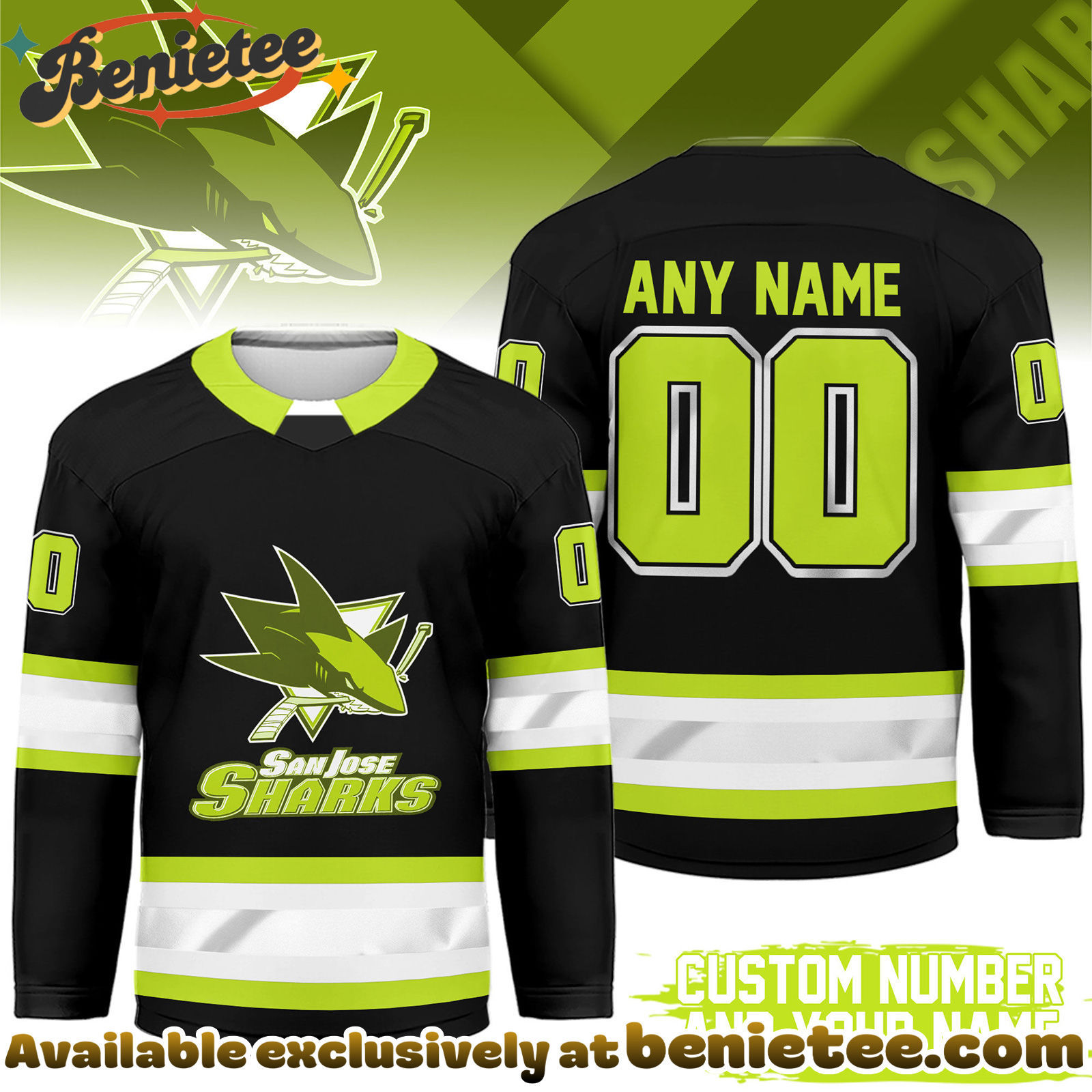 ⚡ Customize your San Jose Sharks Premium NHL Hi-Vis Hockey Spirit Custom Name and Number Jersey now and wear your hockey passion with confidence and style! 🏒🔥