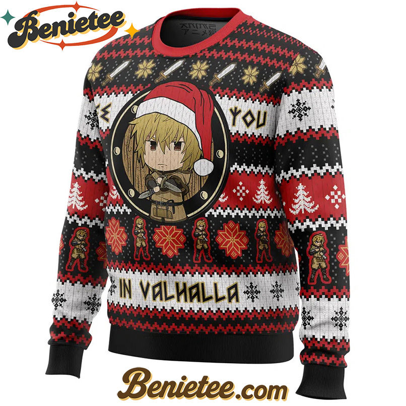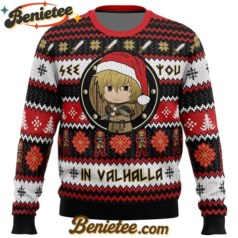 Celebrate the season with the See You in Valhalla Vinland Saga Christmas Sweater — a playful, cozy ugly sweater made for joyful holiday moments.