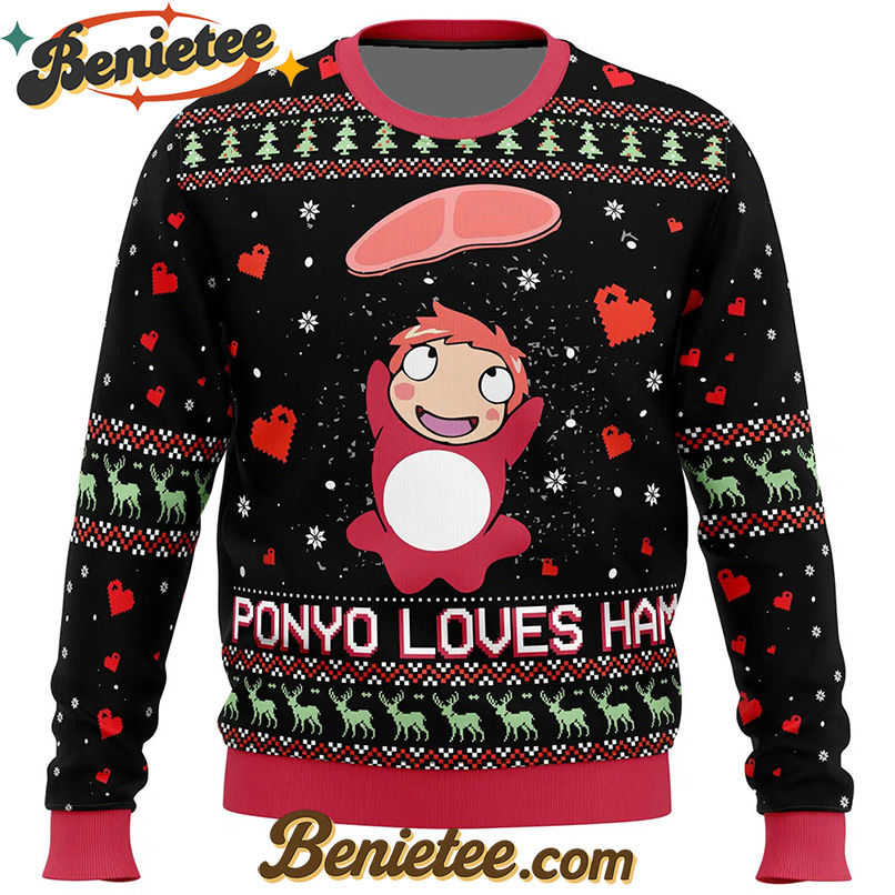 Celebrate the season with the Studio Ghibli Ponyo Loves Ham Miyazaki Ugly Christmas Sweater — a playful, cozy ugly sweater made for joyful holiday moments.