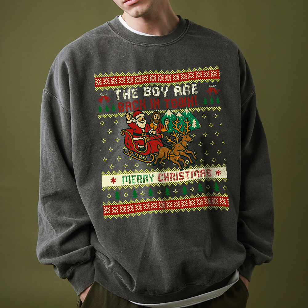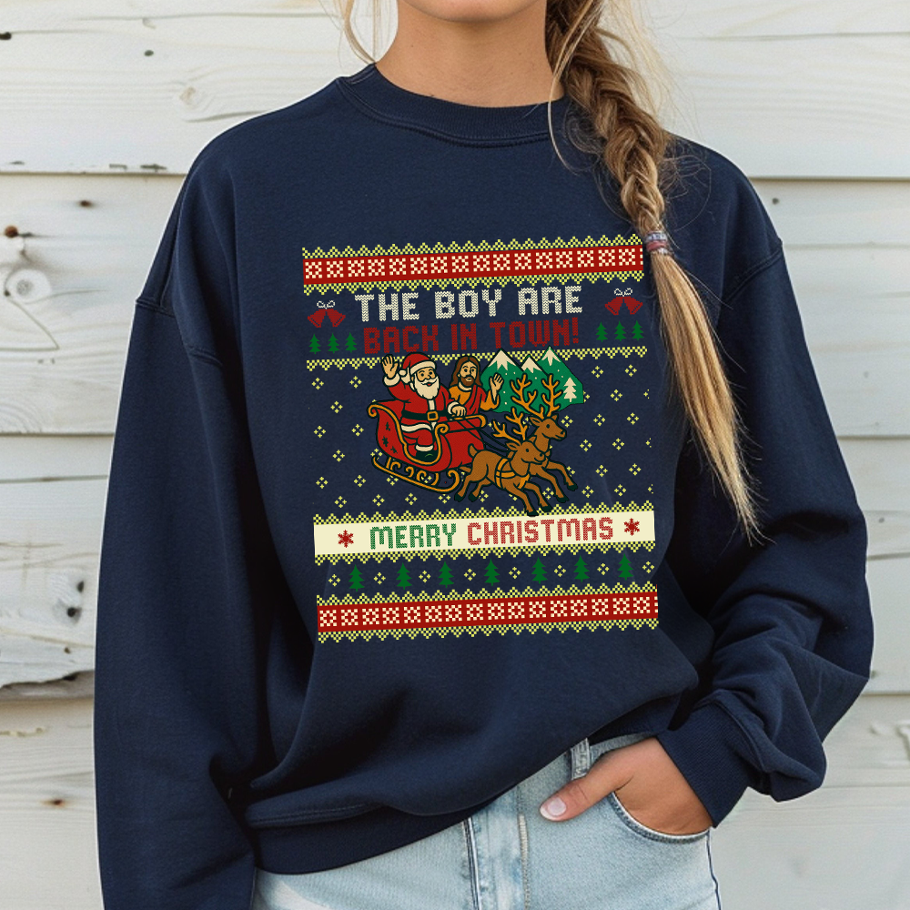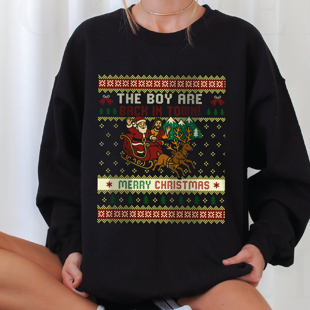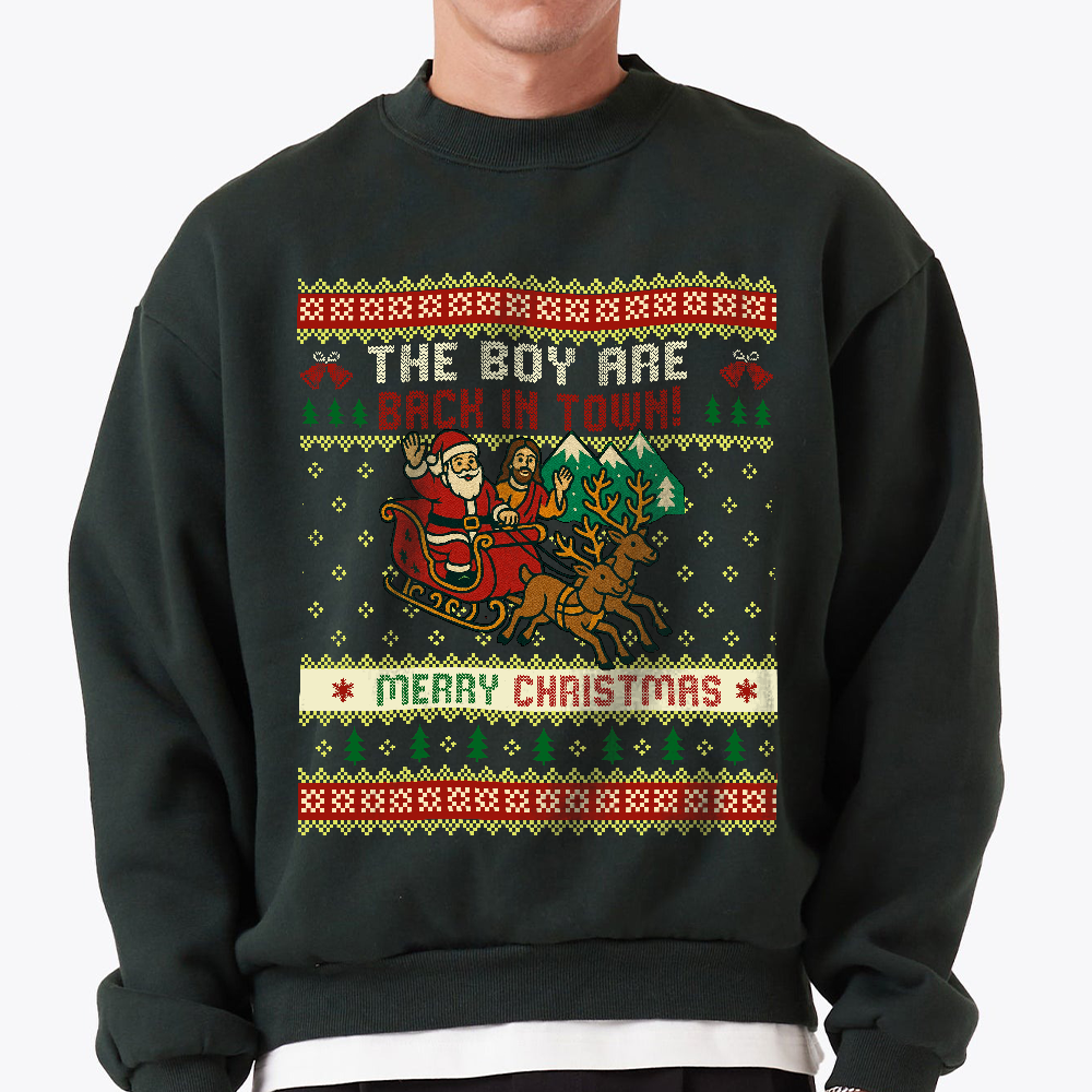 - This item: The Boys Are Back in Town Ugly Christmas Sweatshirt, Santa Lover Crewneck, Santa & Jesus Christian Sweatshirt, Xmas Sweater, Funny Christmas Tee
