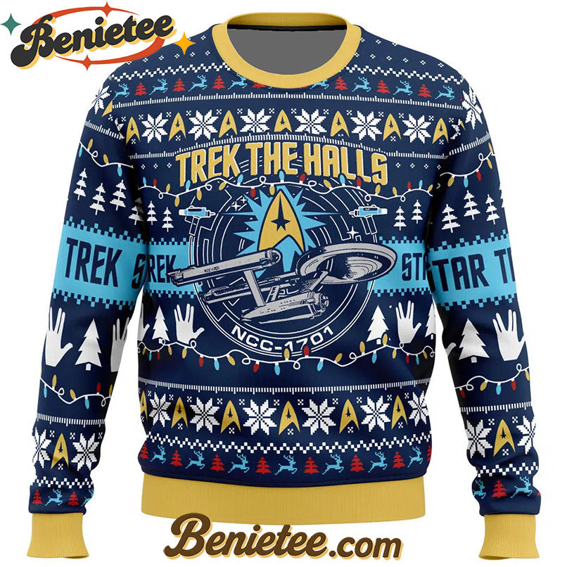 Celebrate the season with the Trek The Halls Star Trek Ugly Christmas Sweater — a playful, cozy ugly sweater made for joyful holiday moments.