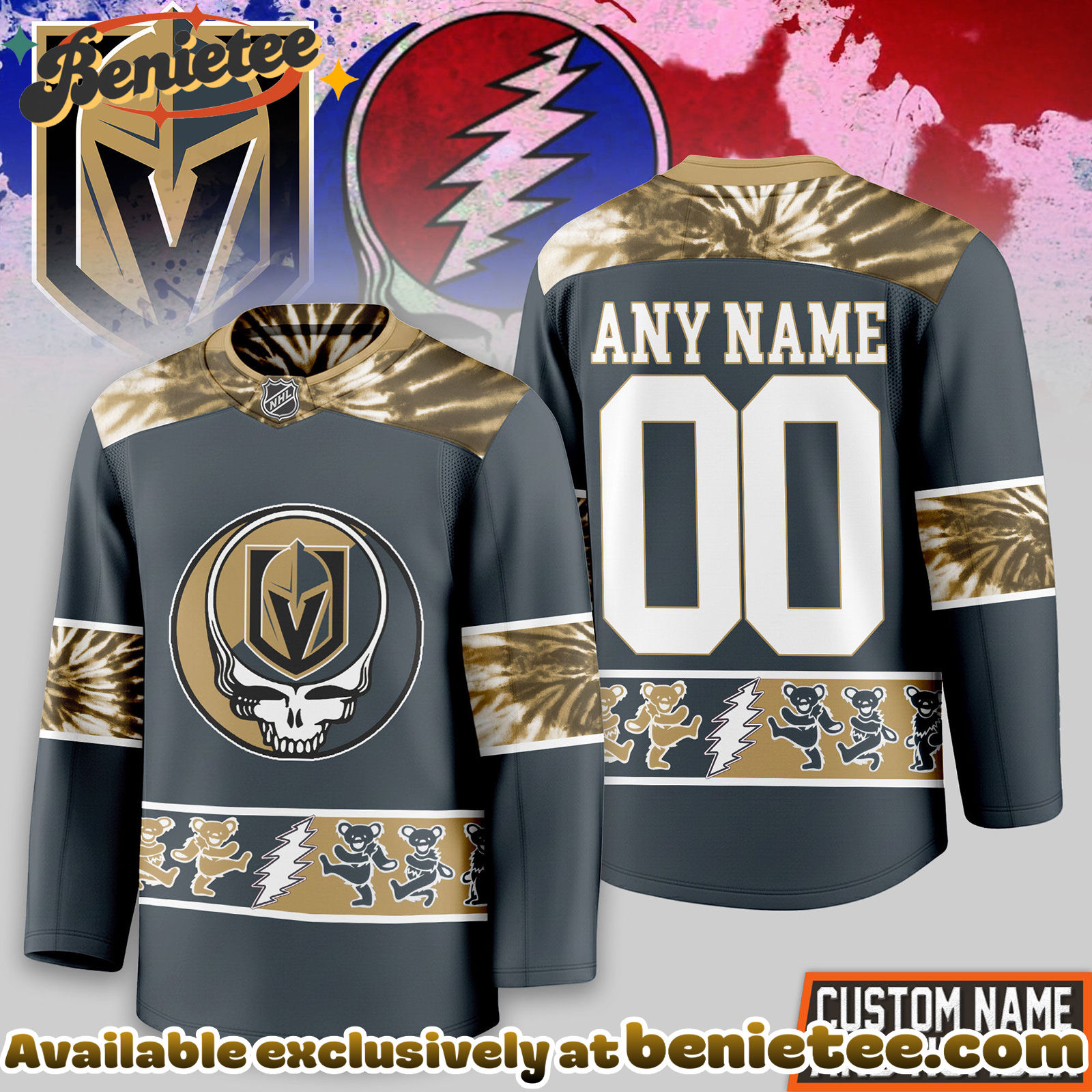 ⚡ Customize your Vegas Golden Knights Premium NHL Tie-Dye Skull Hockey Jersey now and wear your hockey passion with confidence and style! 🏒🔥