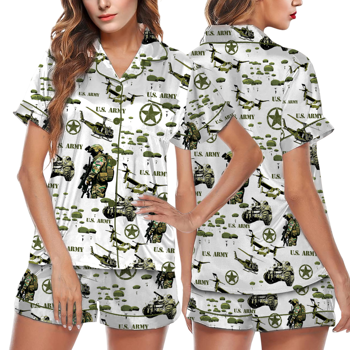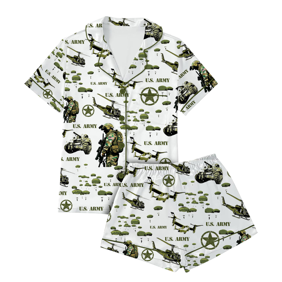 Vintage USA Army Military Green Camouflage Pajamas Set Short, Unisex Army Camo Apparel, Military Veteran Gift