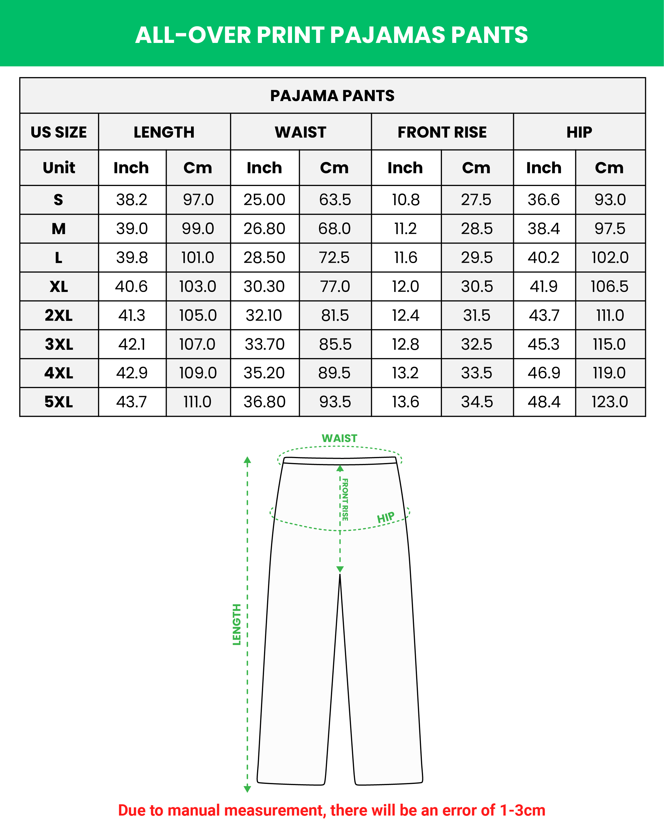 | US SIZE | WAIST (in) | LENGTH (in) | HIPS (in) |